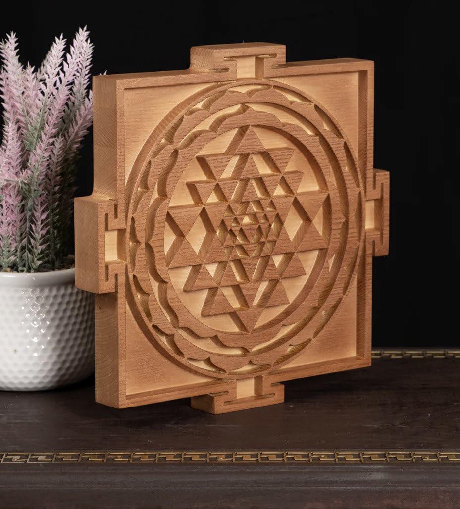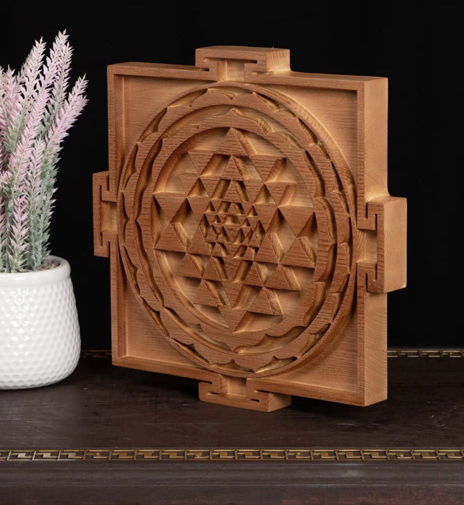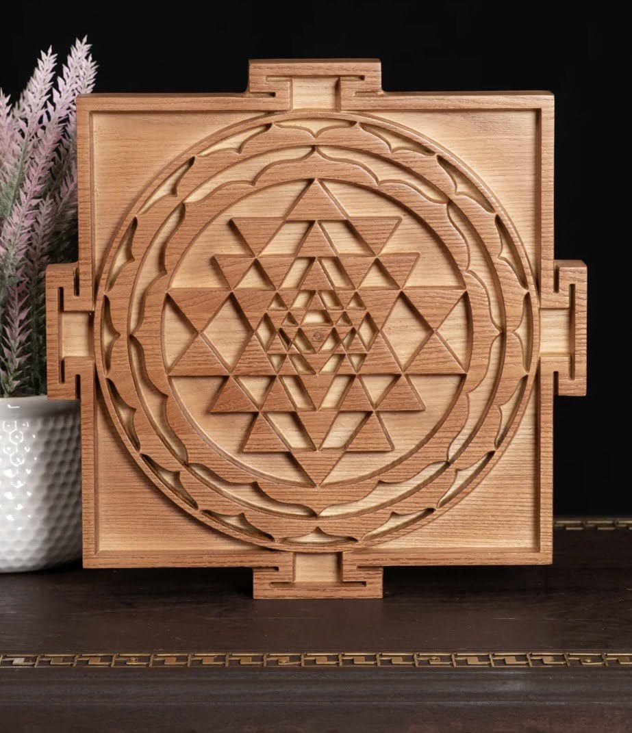 - AUTHENTIC DESIGN: Intricately carved Sri Yantra sacred geometry pattern featuring nine interlocking triangles surrounded by circular lotus petals in premium wood