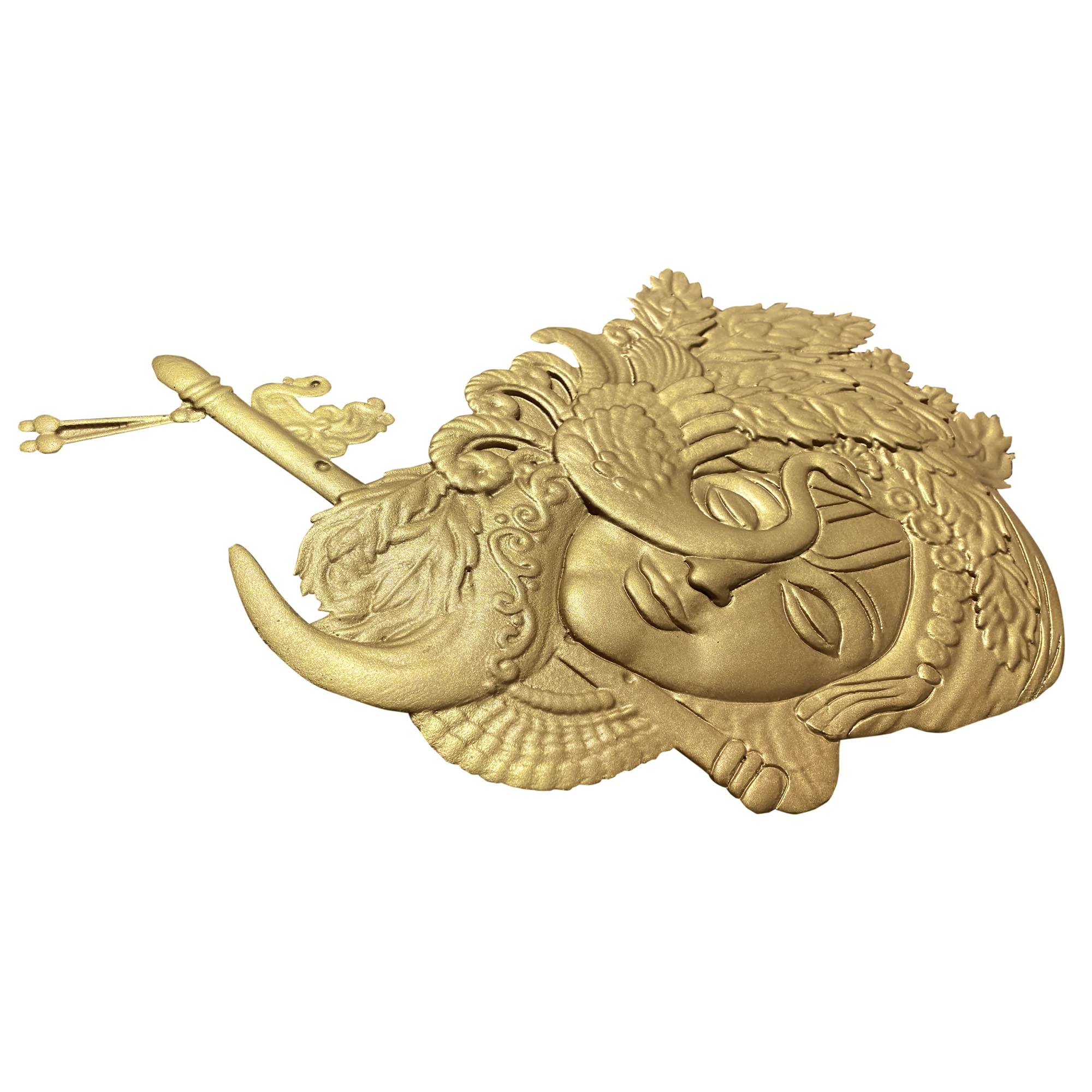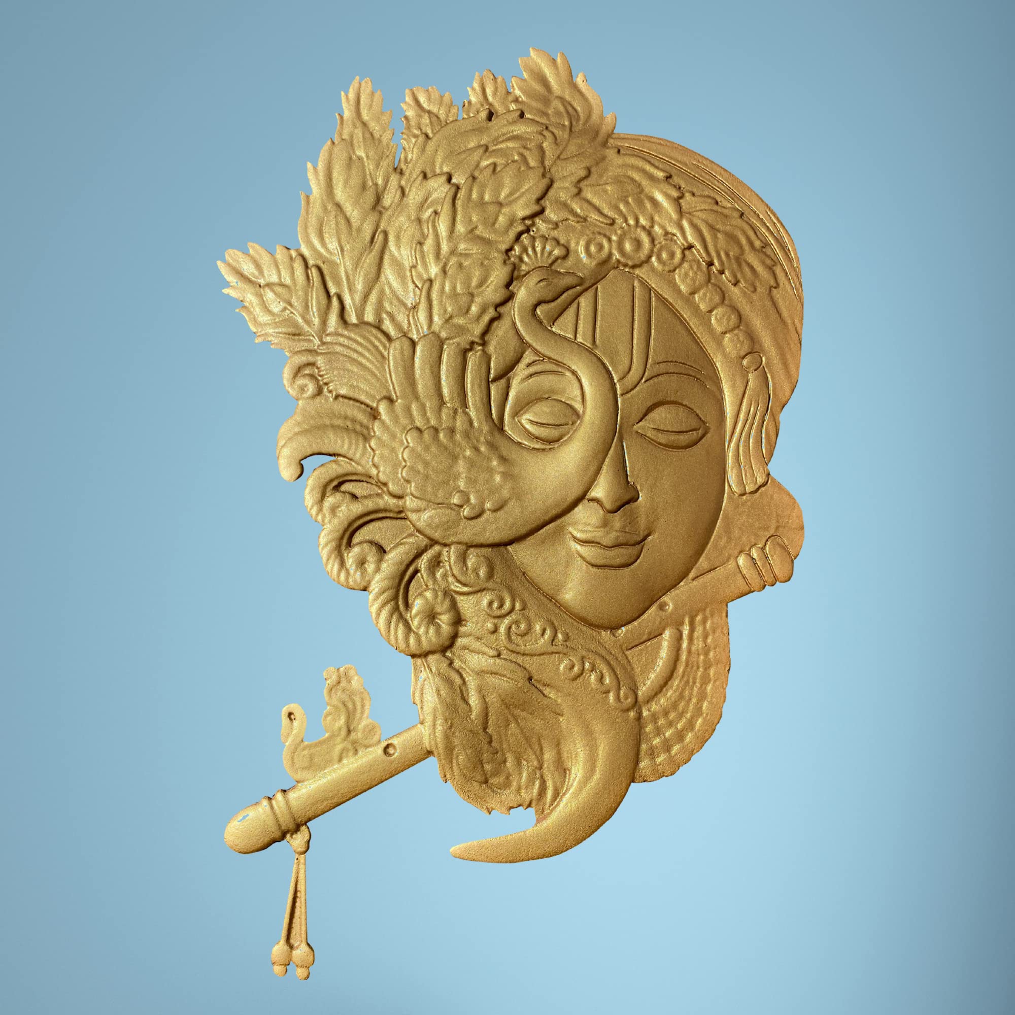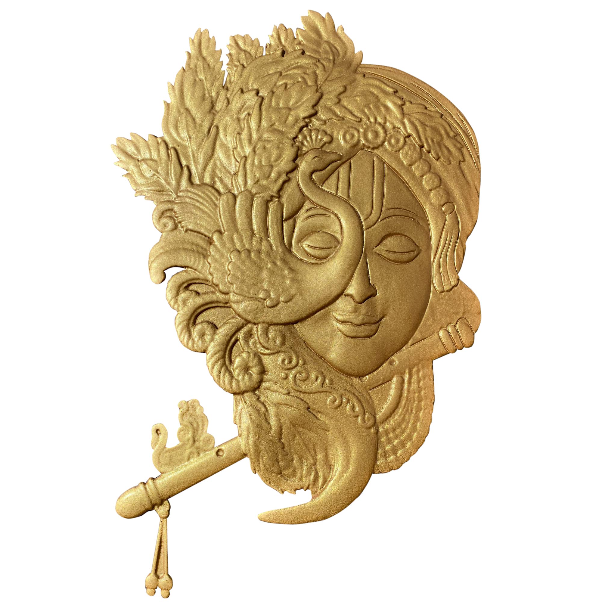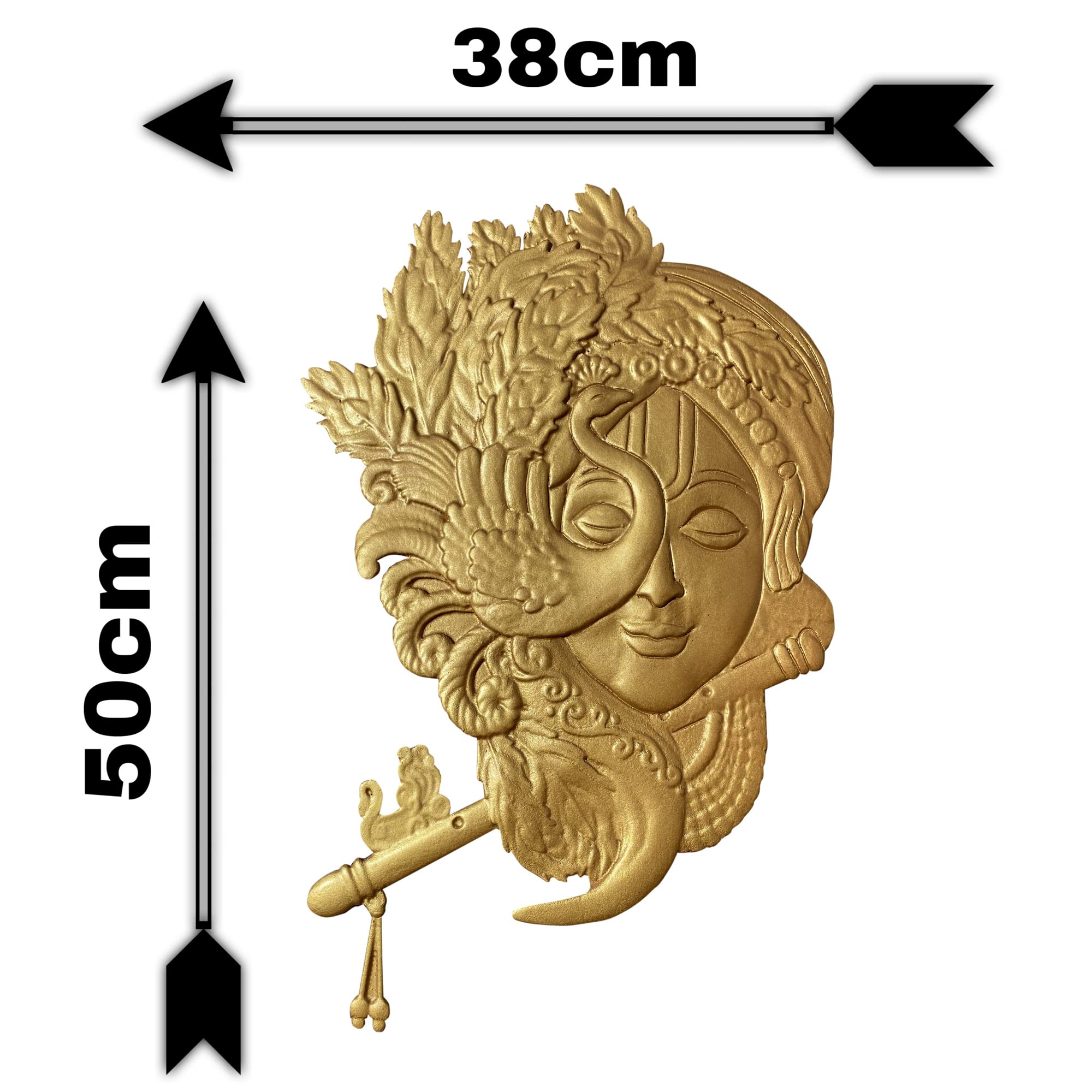 krishna wooden carving statue (golden) artificial wall decor Beautifully and Finely Crafted Lord Krishna Set on Wood The leg which has tape on the back, with which you can easily put it on your wall size- 38x50x0.2